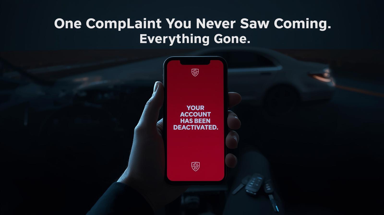 Four point eight rating. Consistent earnings. A schedule that works. A client base that is starting to grow. Everything you have built — the income, the independence, the momentum — sitting on top of a foundation that can crack without warning from a single passenger complaint filed through an app you cannot monitor, reviewed by a support agent you will never speak to, resulting in a deactivation email that arrives with no appeal timeline and no explanation beyond a policy reference number.